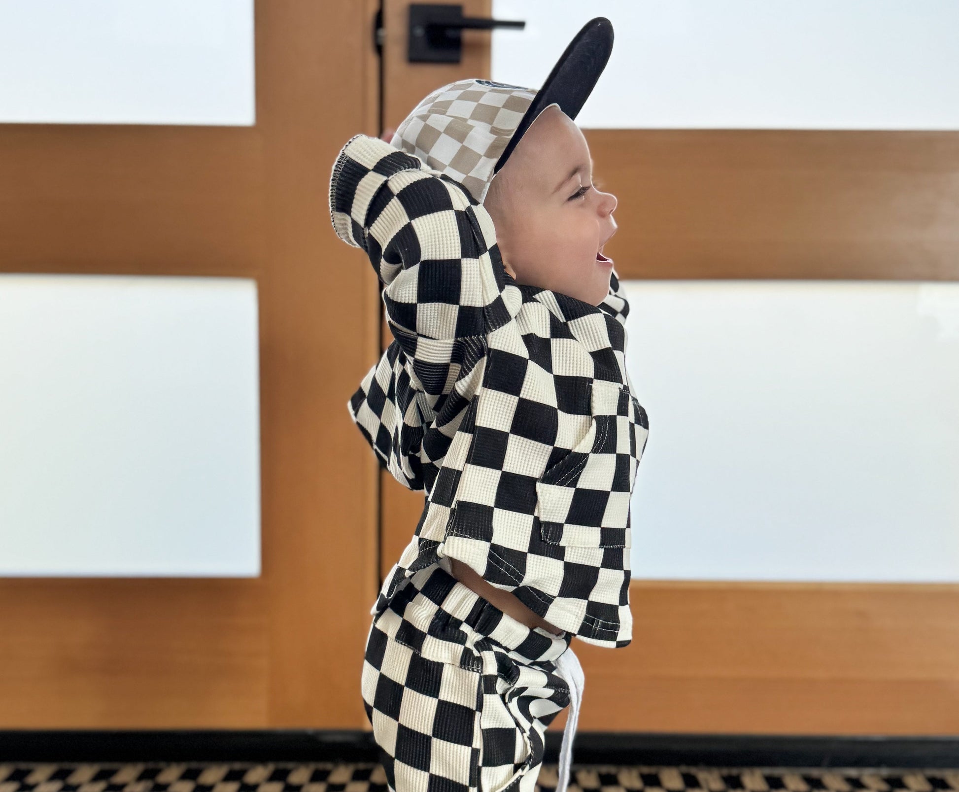 Classic, cool, and made to move — this black and white checkered waffle set brings the heat to everyday fits. Crafted with soft, stretchy waffle knit fabric, it’s comfy enough for playtime and bold enough for street-style snaps.