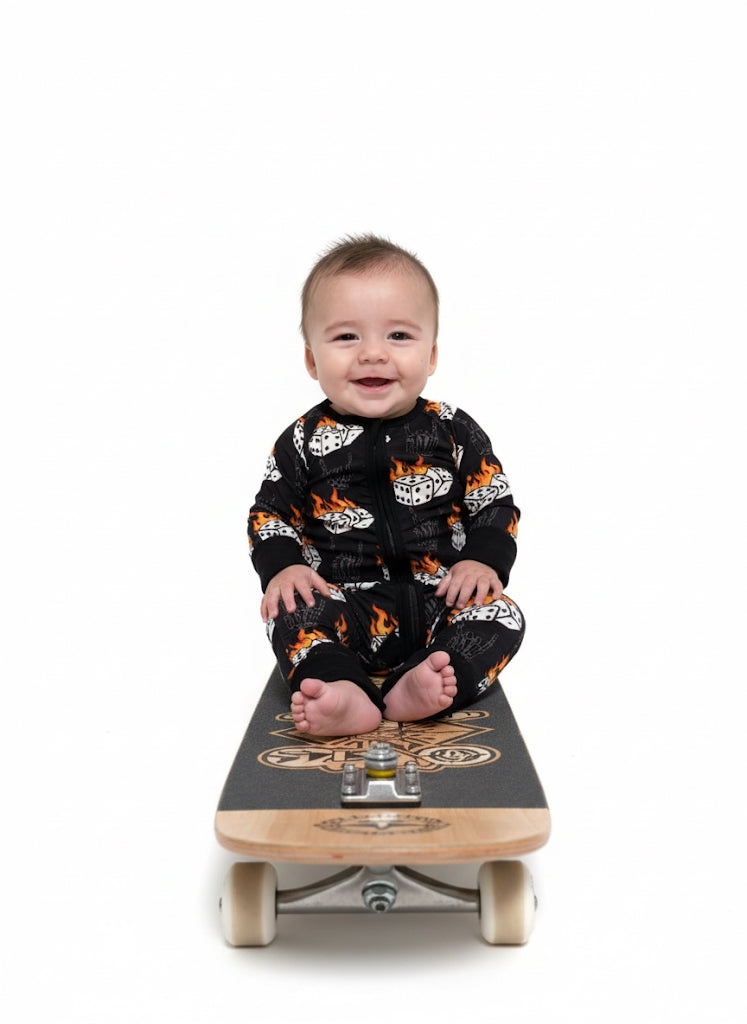 Let your little ones roll the dice and fire up their dreams with our LUCKY STREAK • BAMBOO ZIPPIES. Made of soft bamboo fabric, these pajamas feature a playful dice and flames design, ensuring a cozy and adventurous sleep for your kids.