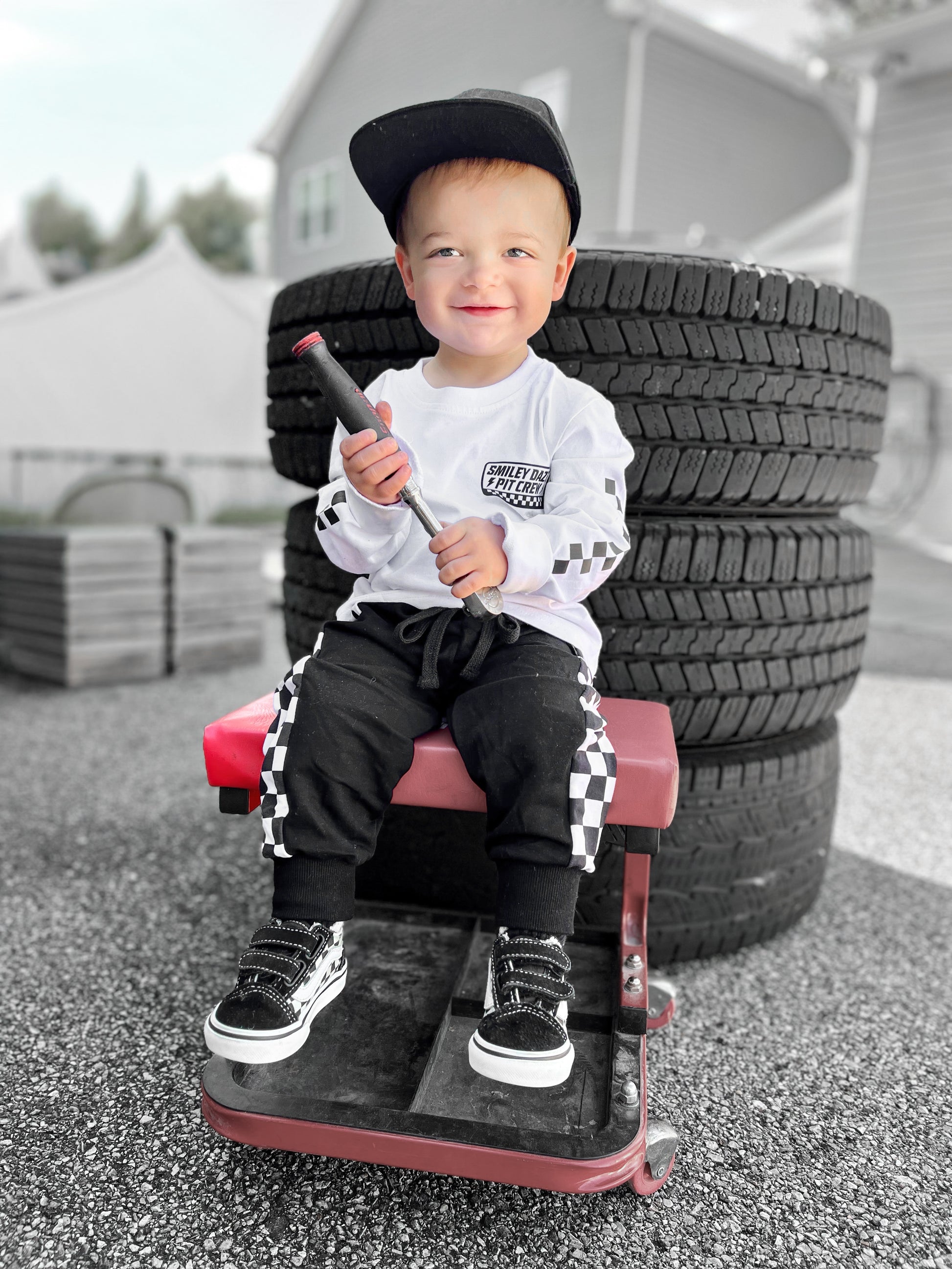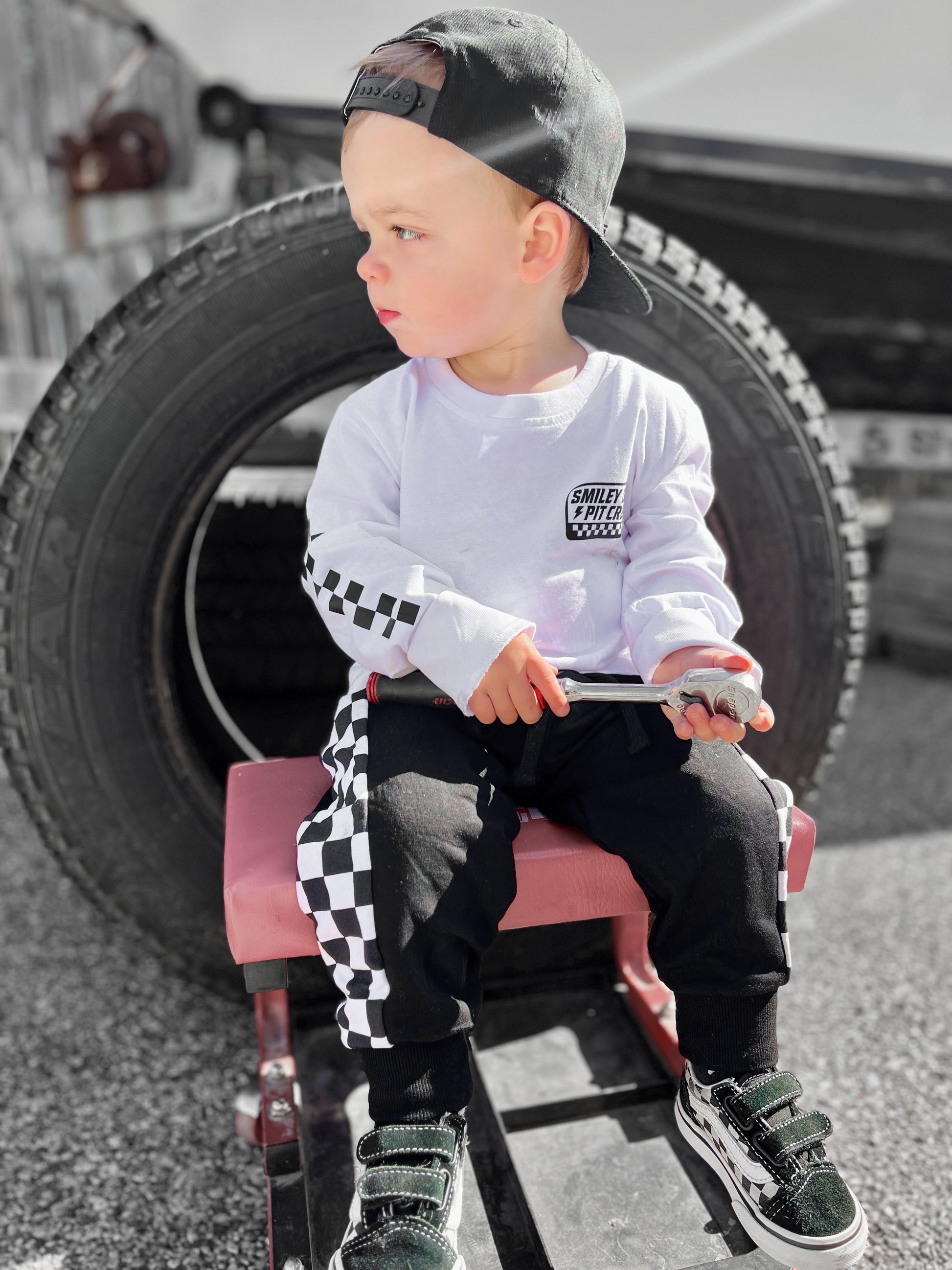 Our Side Check Black Joggers are BACK AGAIN ! They combine comfort with a fun twist. Crafted from a soft cotton-spandex blend, they provide just the right stretch for any activity. The functional drawstring waist for an adjustable fit, while the bold side checkered pattern adds playful style to your everyday look. Perfect for pairing with our Midnight Crew and Need for Speed long sleeve