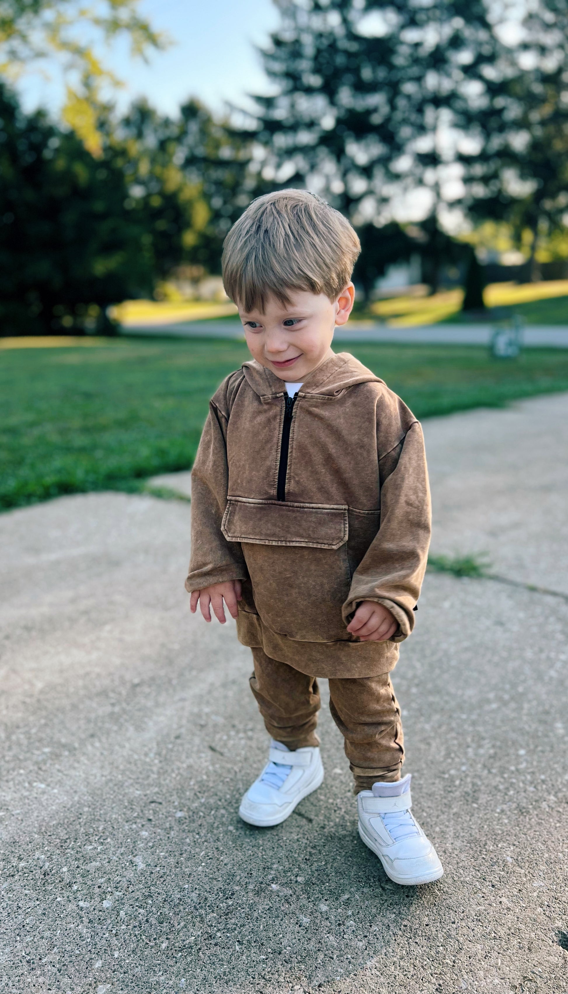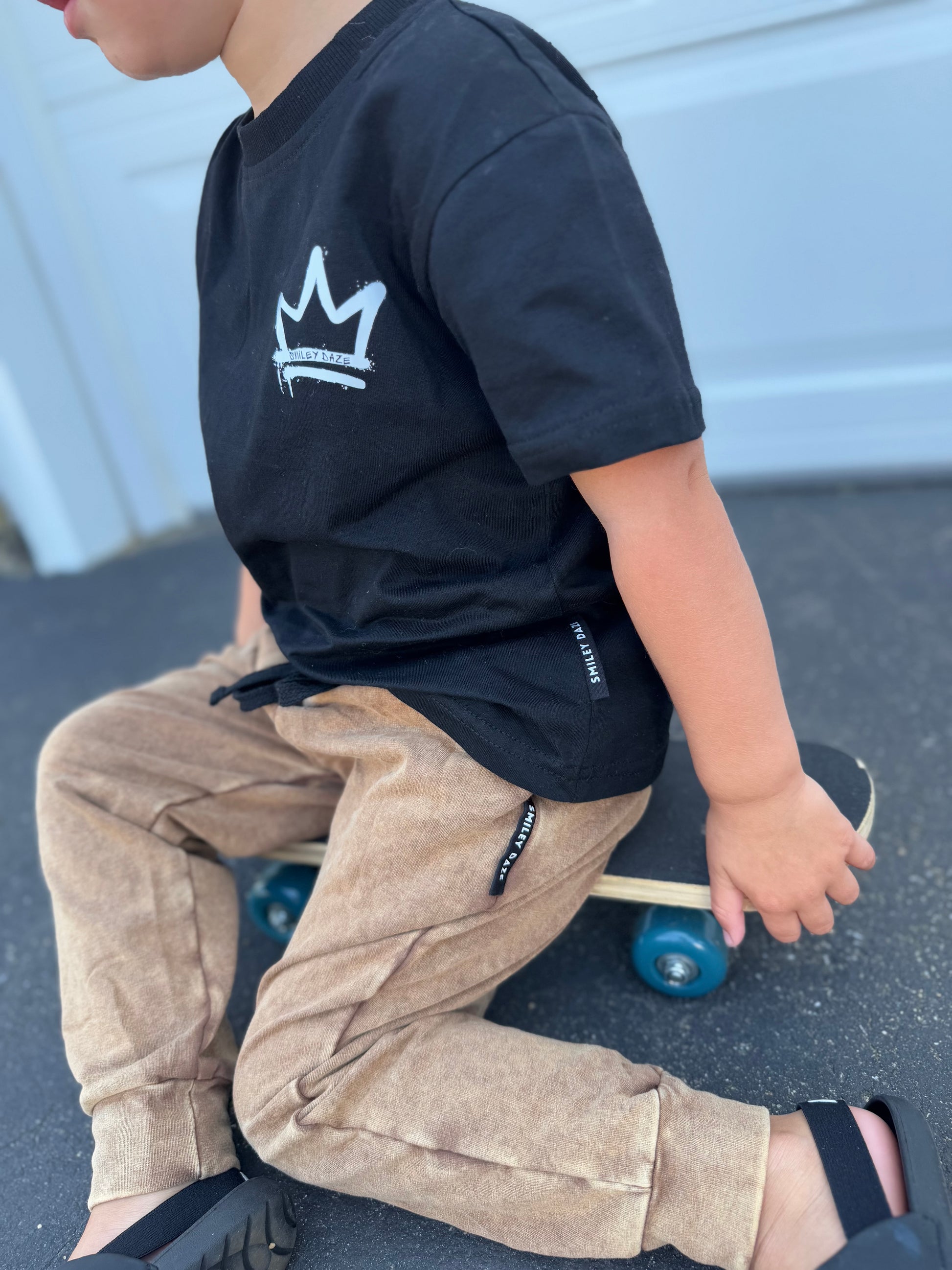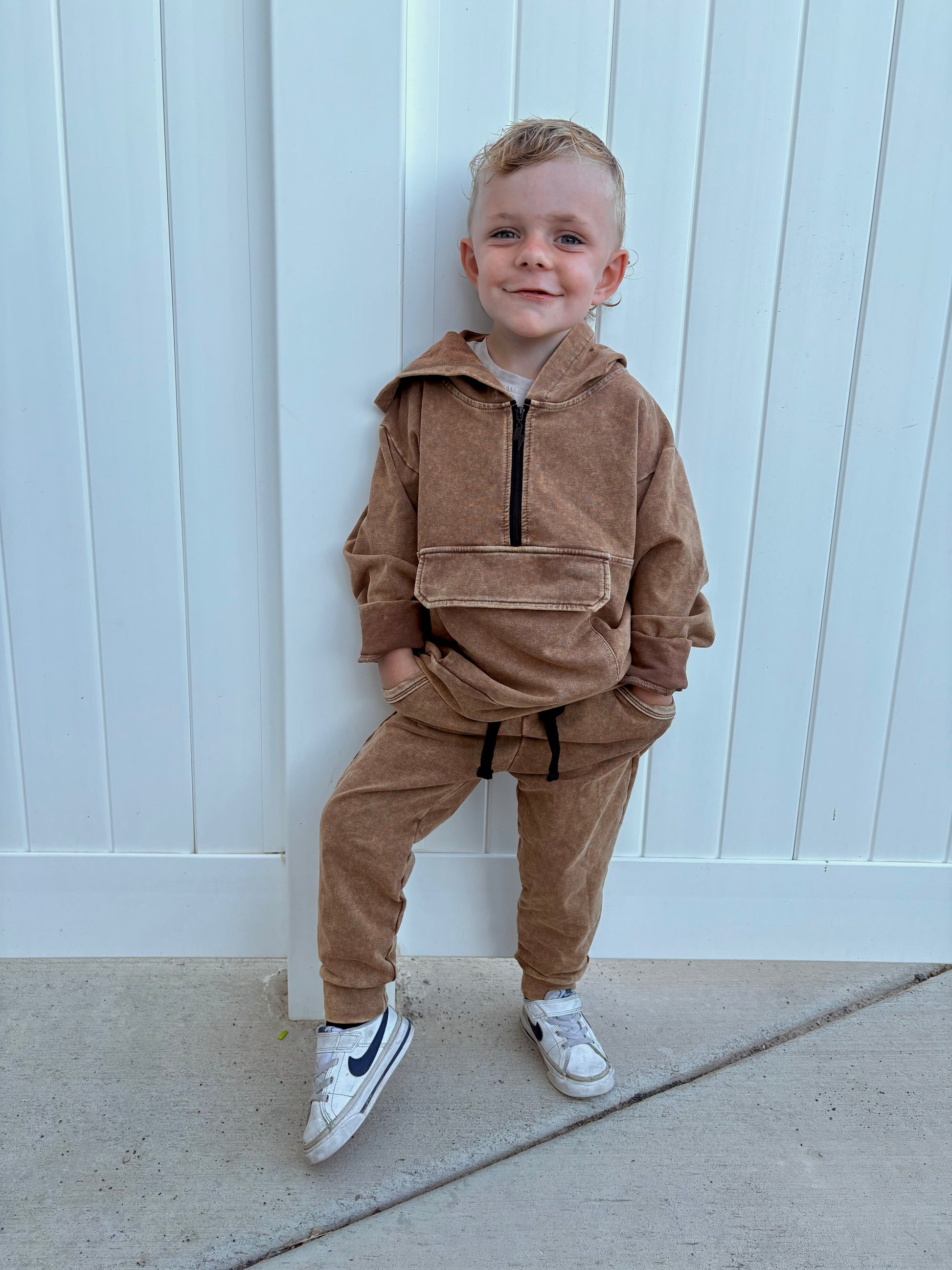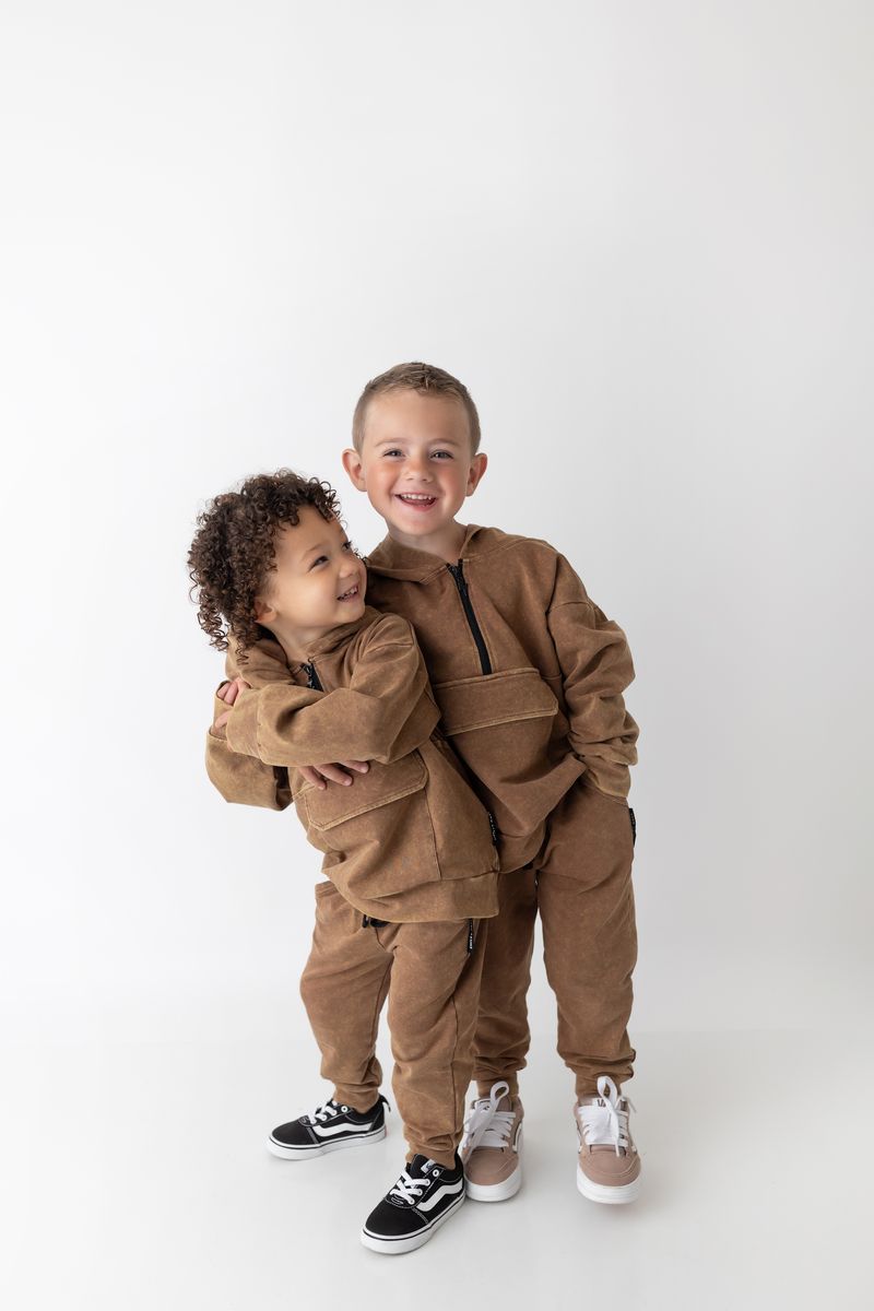 Our Vintage Bronze Joggers are the ultimate everyday essential with a bold edge. Designed in a custom acid-wash finish, these joggers feature a comfy elastic waistband with contrast black drawstring, deep pockets for all the tiny treasures, and ribbed cuffs for that clean fit. Made from a durable cotton spandex blend, they’re soft with just the right stretch for all-day play. Pair them with the matching hoodie or mix with a graphic tee for a full vibe.